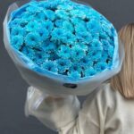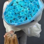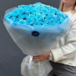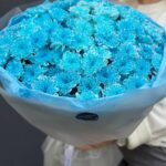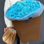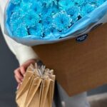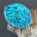 Букет из 25 голубых кустовых хризантем в одноразовой сумке-переноске и вазе из картона, наполненной водой. Быстрая доставка по городу.