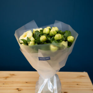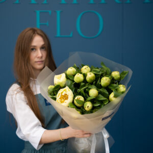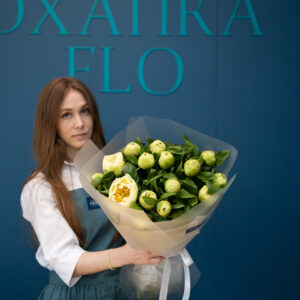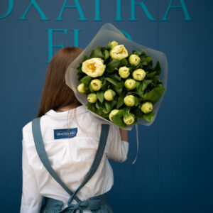 Букет из 15 пионов сорта «Лемон шифон» в сумке-переноске — это стильный и практичный подарок, который порадует своей красотой и свежестью.