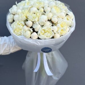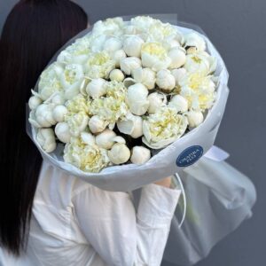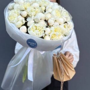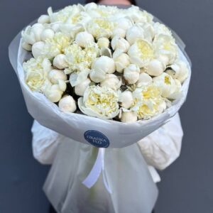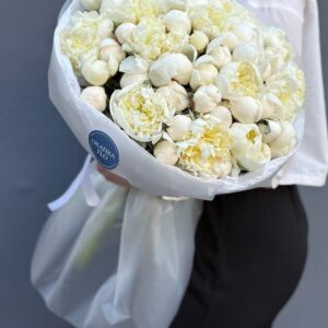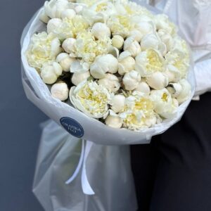 Нежные и воздушные лепестки пионов имеют бело-кремовый оттенок, что делает букет невероятно изысканным и утончённым. Он станет прекрасным дополнением к любому интерьеру и подарит ощущение уюта и гармонии.