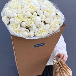 Возможность заказать букет из 51 кремовых пионов сорта Дюшес де Немур в сумке-переноске и одноразовой вазе из картона, наполненной водой. Быстрая доставка по городу.
